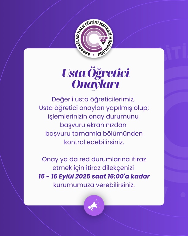 Değerli usta öğreticilerimiz, Usta öğretici onayları yapılmış olup; işlemlerinizin onay durumunu başvuru ekranınızdan başvuru tamamla bölümünden kontrol edebilirsiniz. Onay ya da red durumlarına itiraz etmek için itiraz dilekçenizi 15 - 16 Eylül 2025 saat 16:00'a kadar kurumumuza verebilirsiniz.